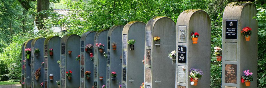 Urnenwände bzw. Kolumbarien enthalten über- und nebeneinander liegende Fächer (Urnennischen), in die die Urnen eingestellt werden. Meist stehen Urnenwände - häufig zu mehreren gruppiert - in freier Lage auf dem Friedhofsgelände.